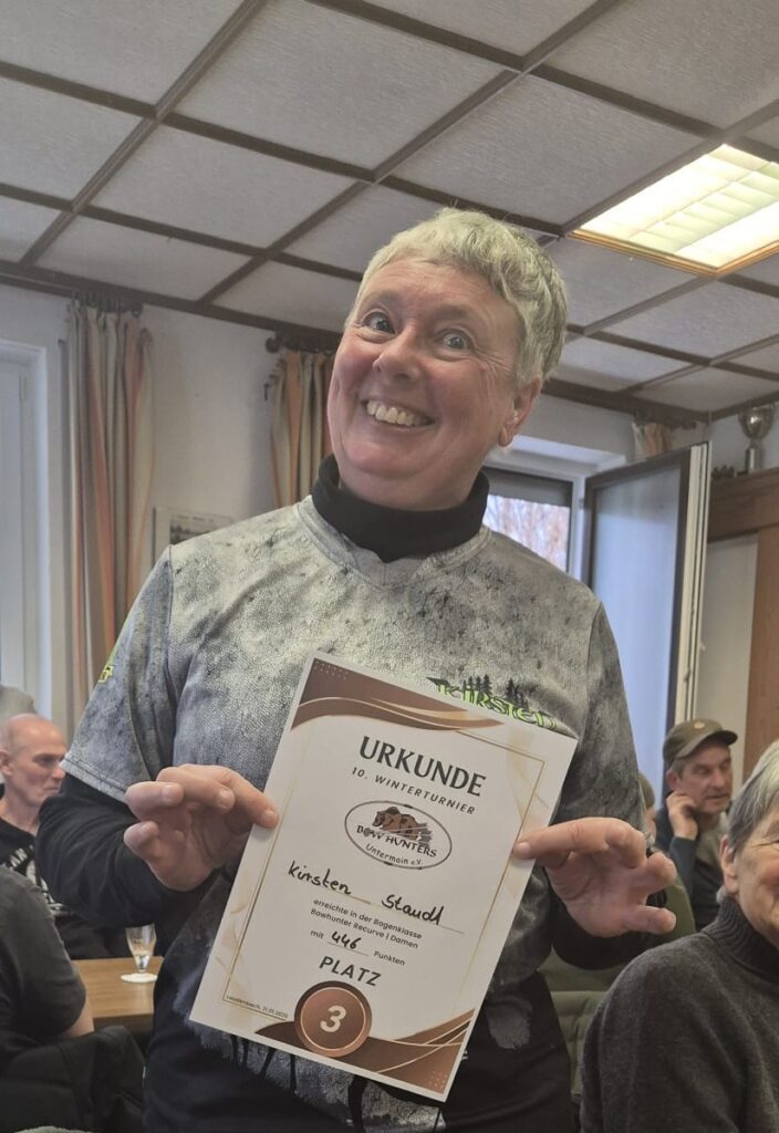 Kirsten Staudt von Schützen Groß-Zimmern belegte bei den Bowhunter-Damen den 3. Platz mit lediglich 8 Punkten Rückstand auf Platz 2. Roman Gottstein aus Babenhausen gewann die Wertung der Kinder.